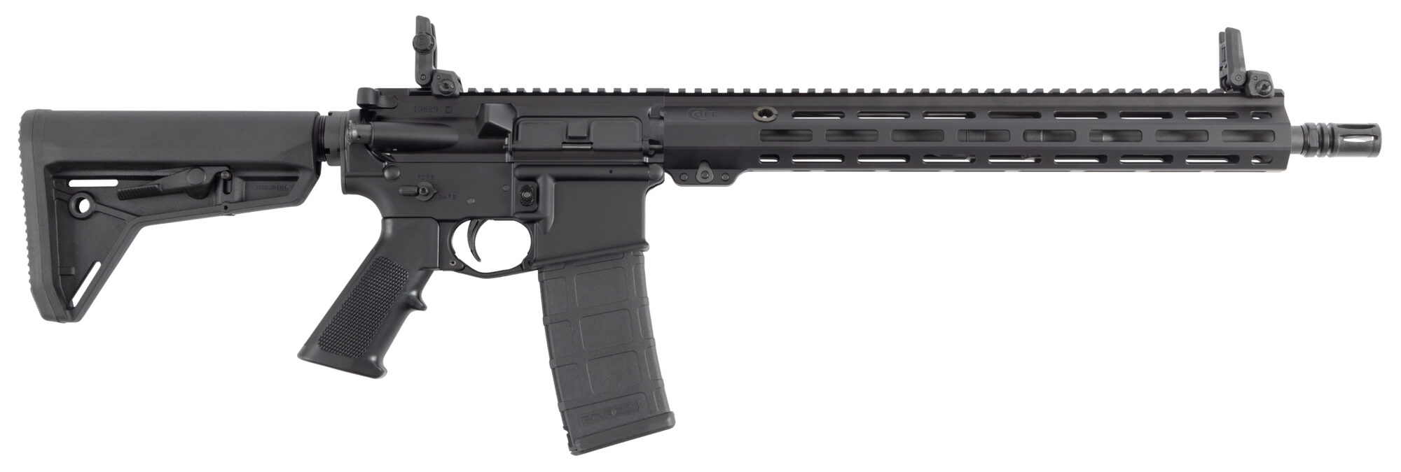 M4 Cage Code Marked Upper Receiver Forging with LE Marked Lower Receiver – New Colt M-LOK Handguard Continuous Top Rail 7-Orientations of M-LOK – 2 Steel Reinforced QD Sling Attachment Points on Handguard – Magpul MBUS 3 Folding Sights – Magpul Enhanced Trigger Guard – Ambidextrous Safety Selector – Magpul SL Stock