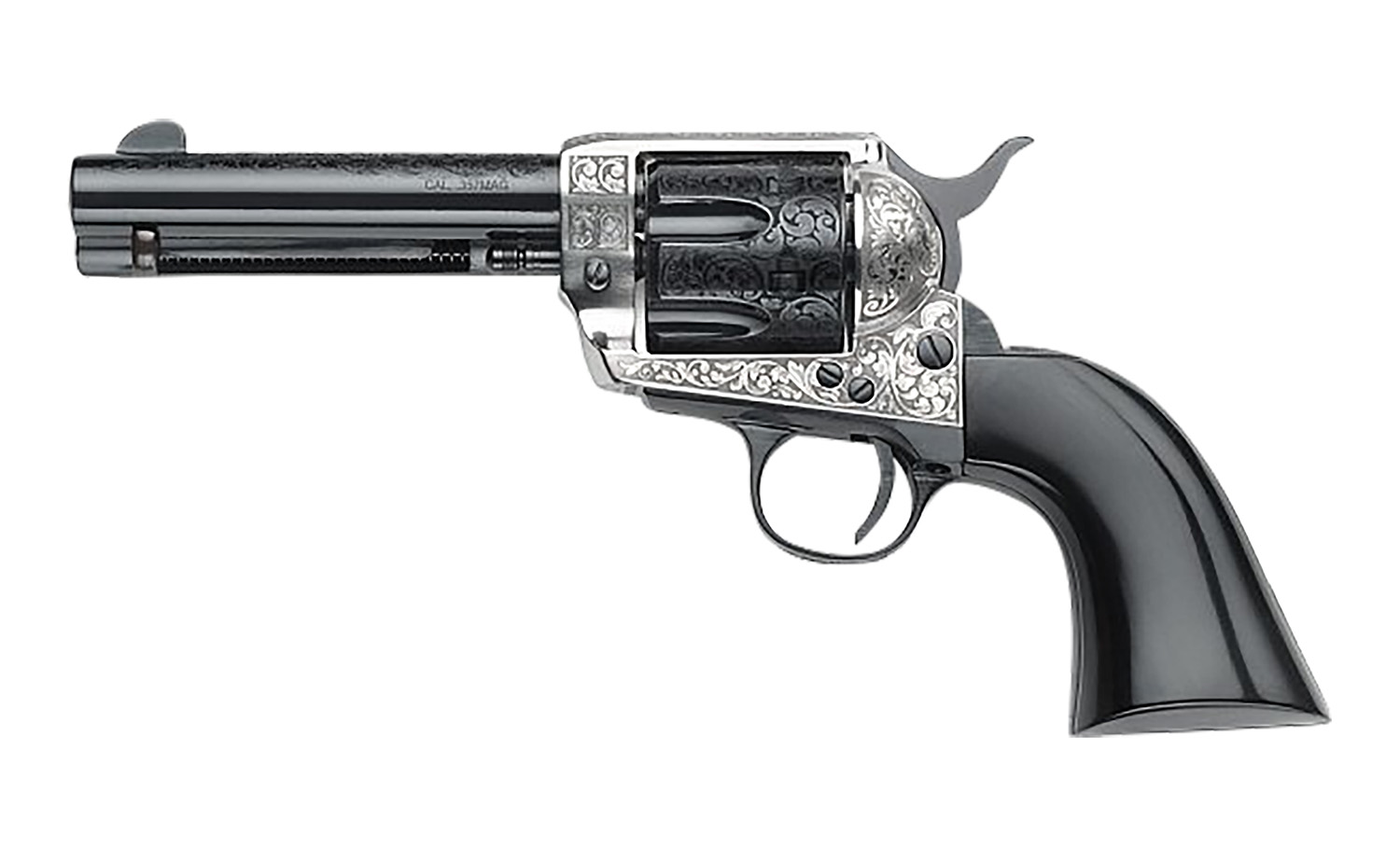 The GWII “Gamblers Royale” is elegantly engraved with a Victorian scroll-work on the contrasting black barrel and the polished steel frame. It is further accented with a one-piece black grip.