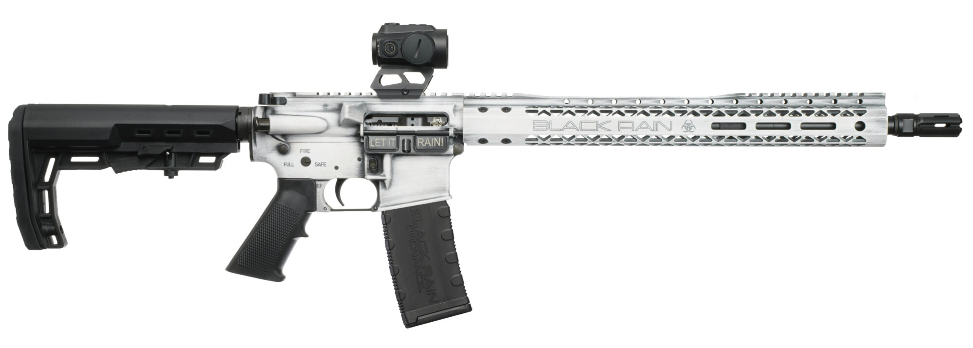 Spec15 Forged Aluminum Receiver Set – 5.56: 16 4150V Chromoly Barrel – 15 MLOK Slim Handguard – Castle Flash Suppressor – Direct Impingement; .750 Low Profile Non-Adjustable Gas Block – Salt Bath Nitride Coated Spec15 BCG – Spec15 Forged Charge Handle – Mil-Spec G.I. Trigger – G.I. Grip – XTS Buttstock – White Battleworn Cerakote Finish – Zero Tech Trace 1×25 Red Dot Optic TRRD125