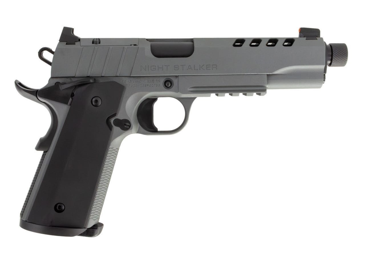 The Nightstalker is a full-size 1911 pistol equipped with an integrated Picatinny Rail and packed with premium features straight from the factory. It includes a skeletonized hammer, and a lowered and flared ejection port for enhanced performance. The SF trigger, titanium firing pin, and ambidextrous safety offer precision and ease of use, while the extended beavertail grip safety and black solid trigger provide extra comfort and control. The pistol also features aluminum grips and rear slide cocking serrations for added durability and handling. Constructed on a forged, front checkered frame and slide for long-lasting toughness, it comes with a cold hammer forged threaded barrel for superior accuracy. The Nightstalker includes two magazines, a cleaning kit, and a lockable rugged case for secure storage and maintenance.